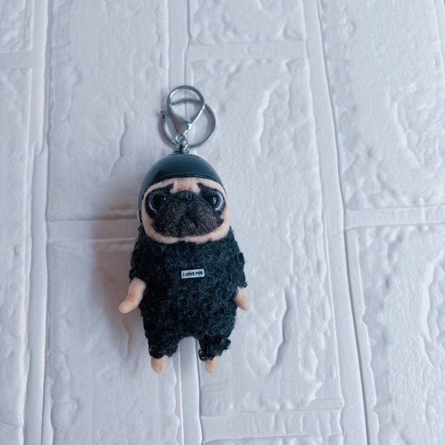 羊毛フェルト黒パグキーホルダー金ヘルメット