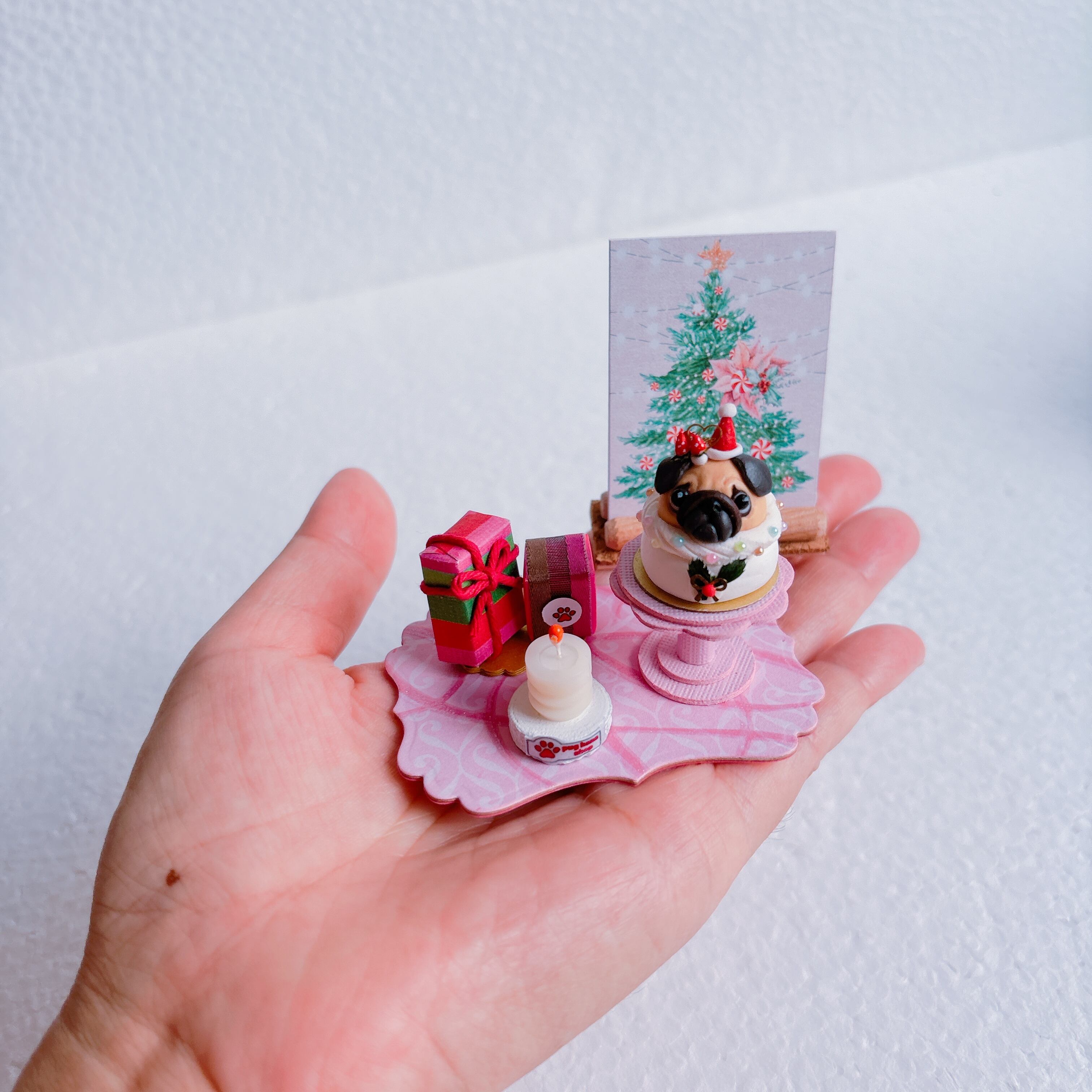 羊毛フェルトパグクリスマスとミニチュアパグケーキ