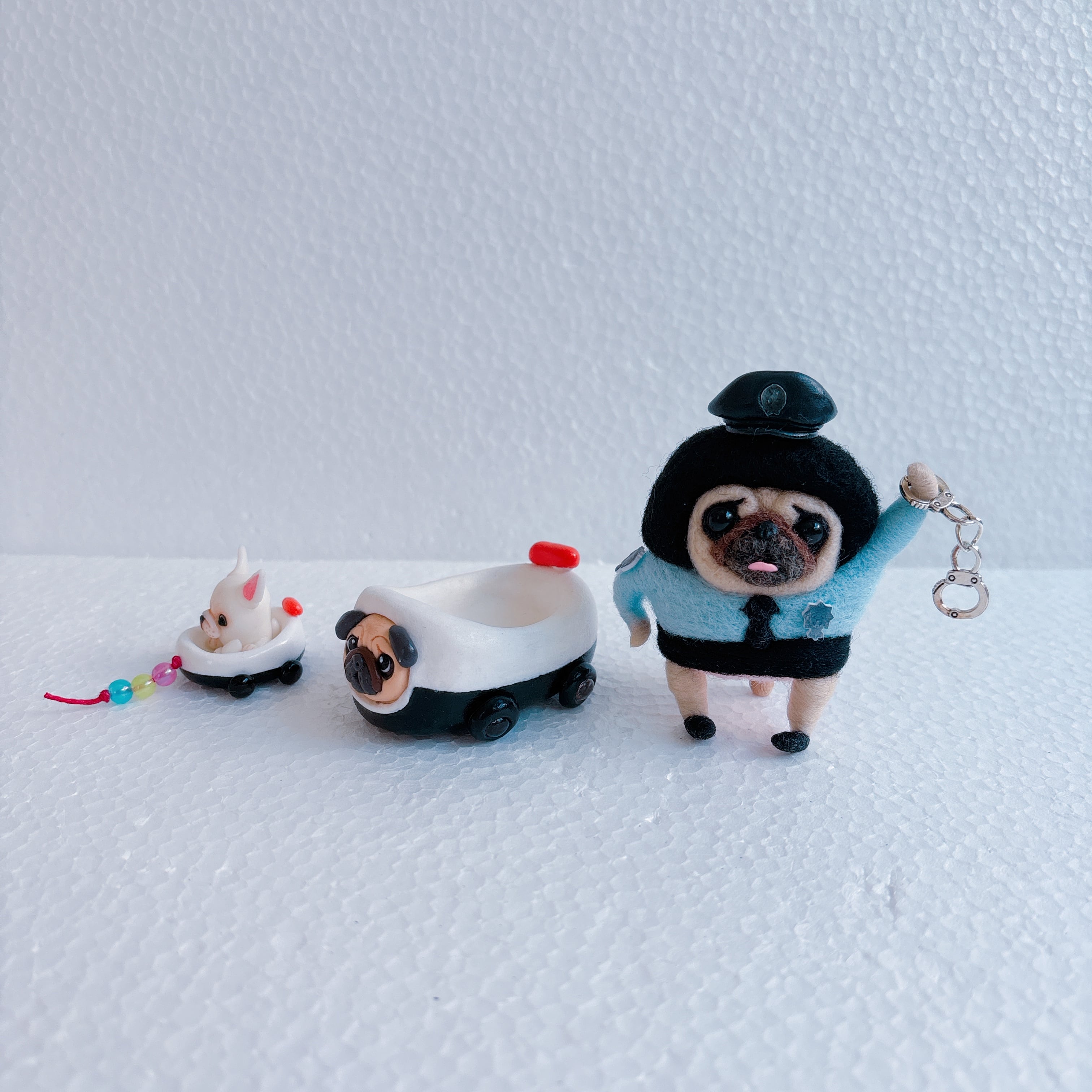 羊毛フェルトパグポリスとパトカー