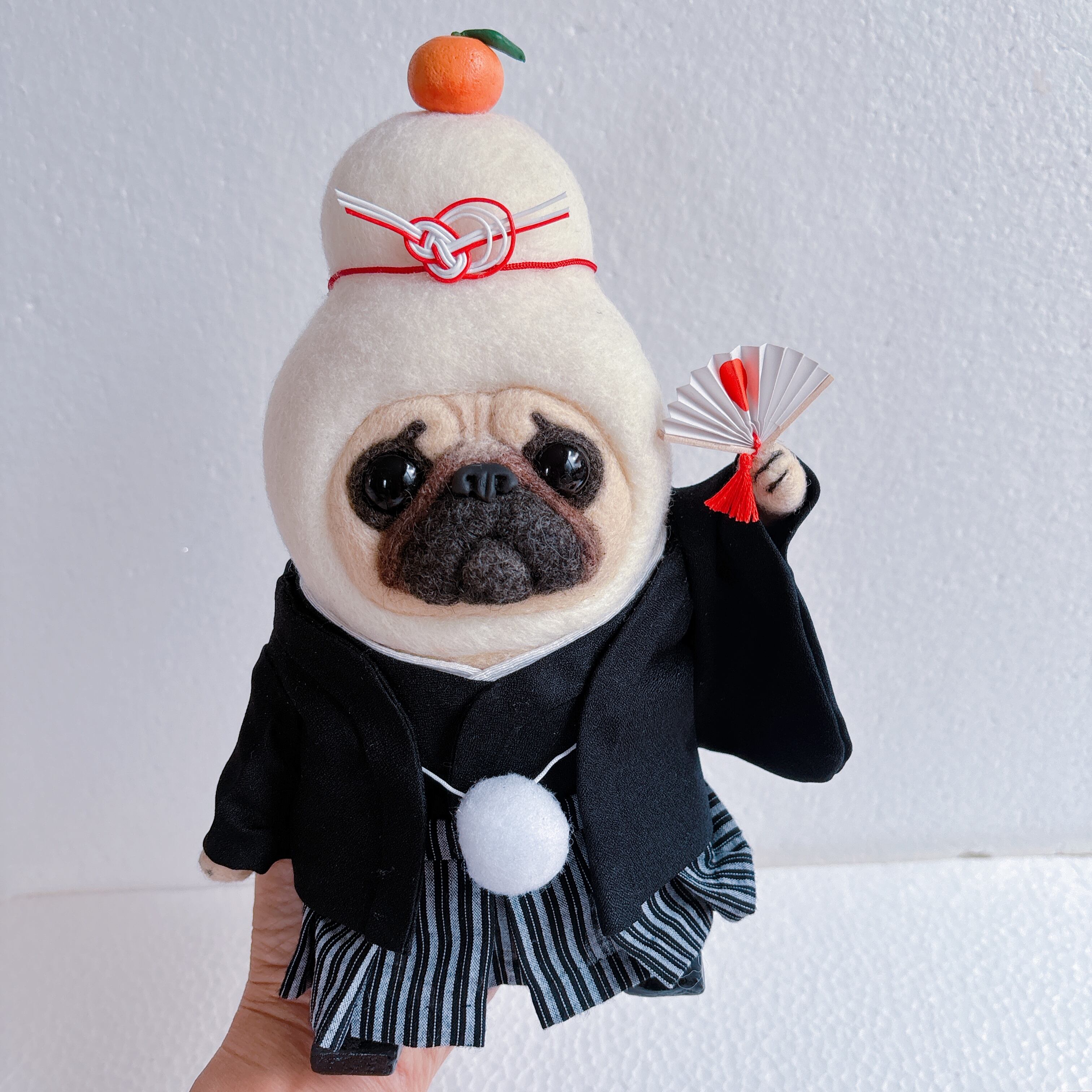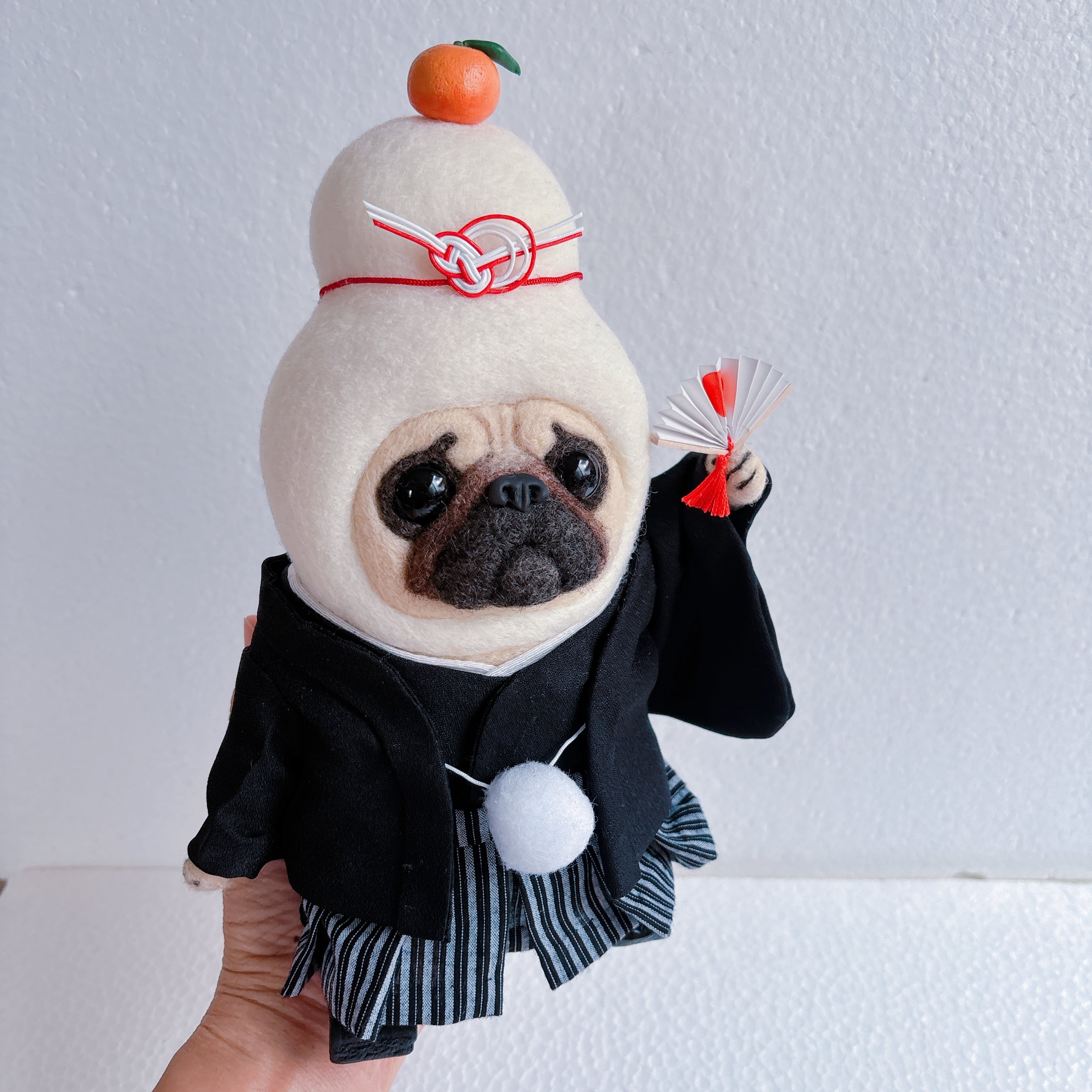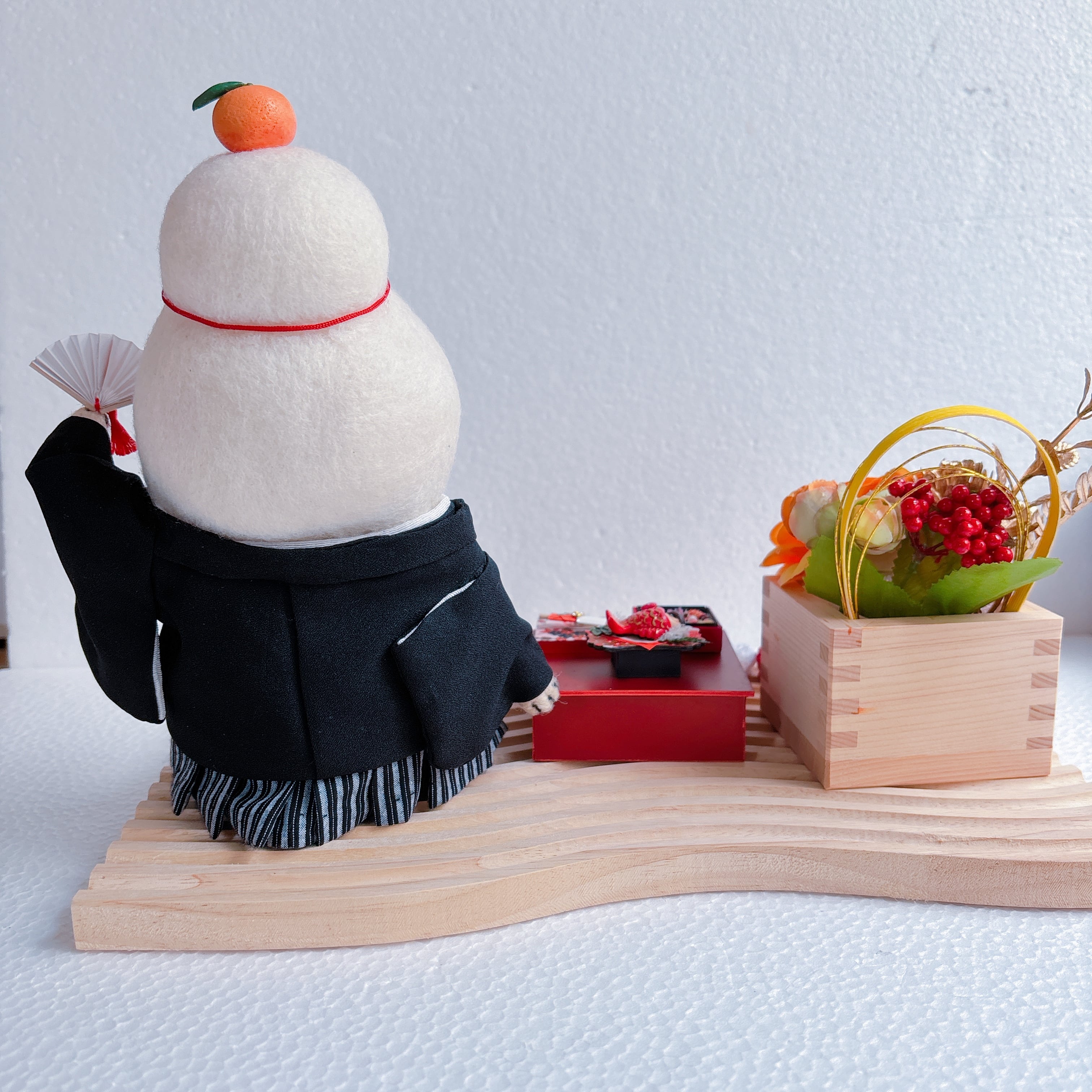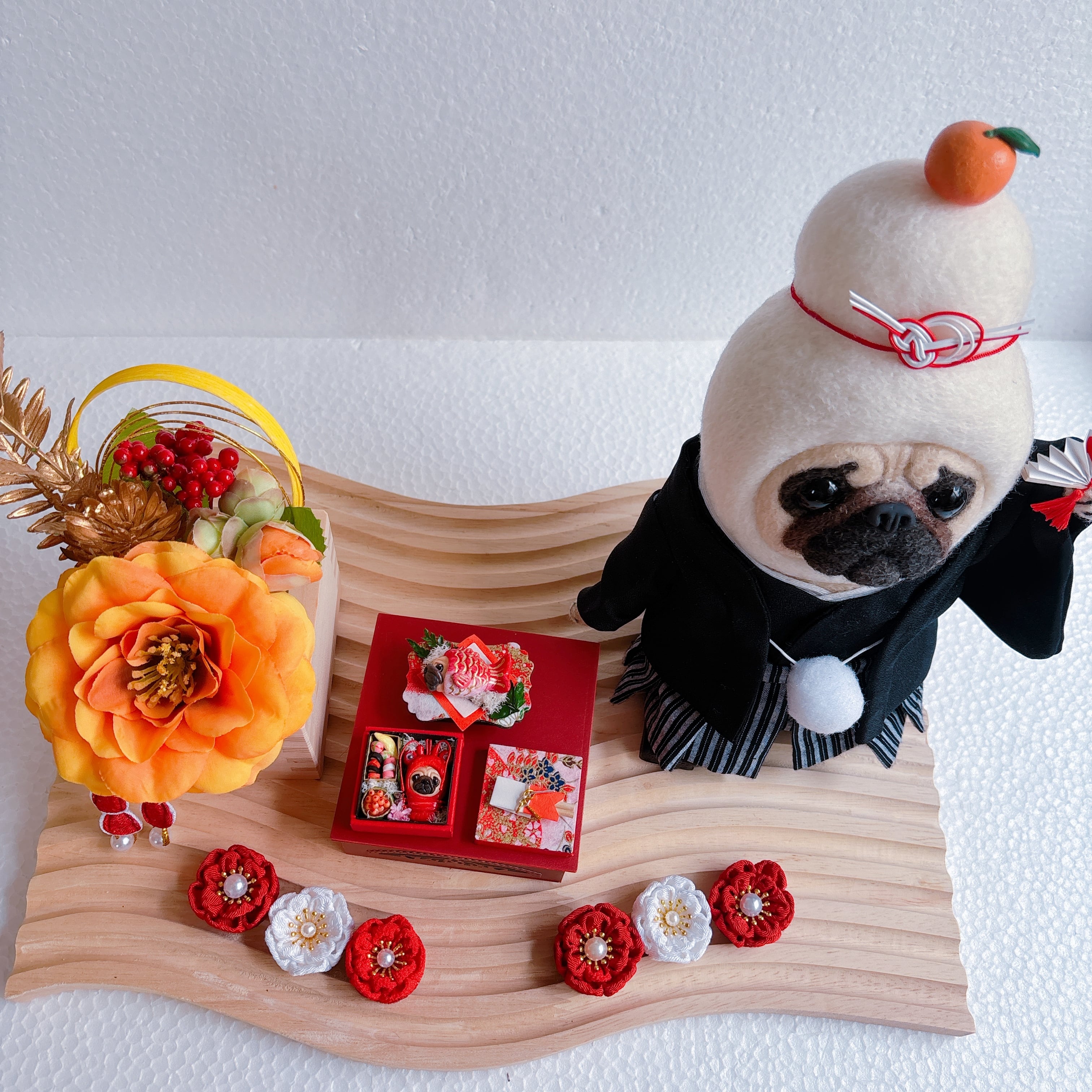 羊毛フェルトパグ鏡餅(特大サイズ)とおせち料理