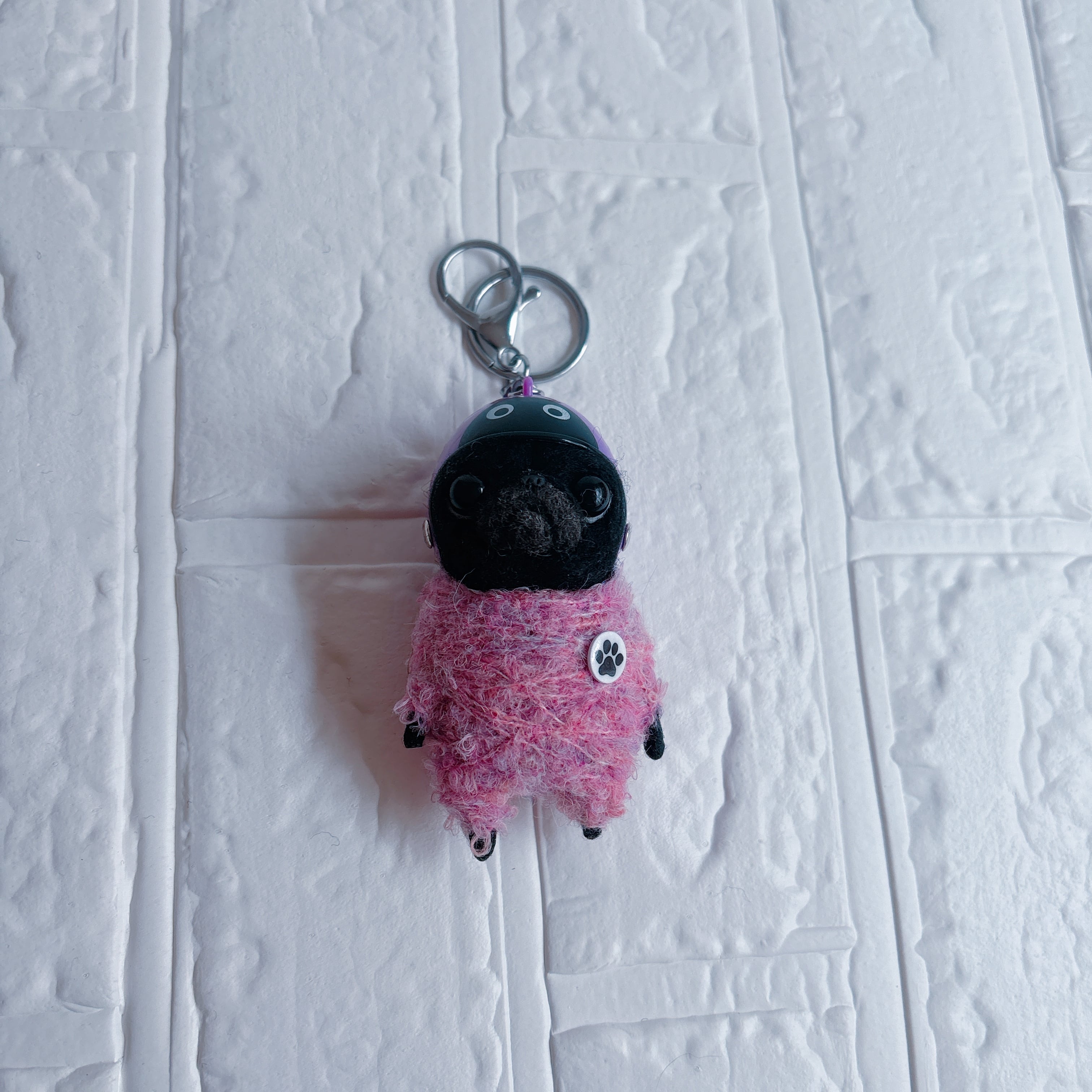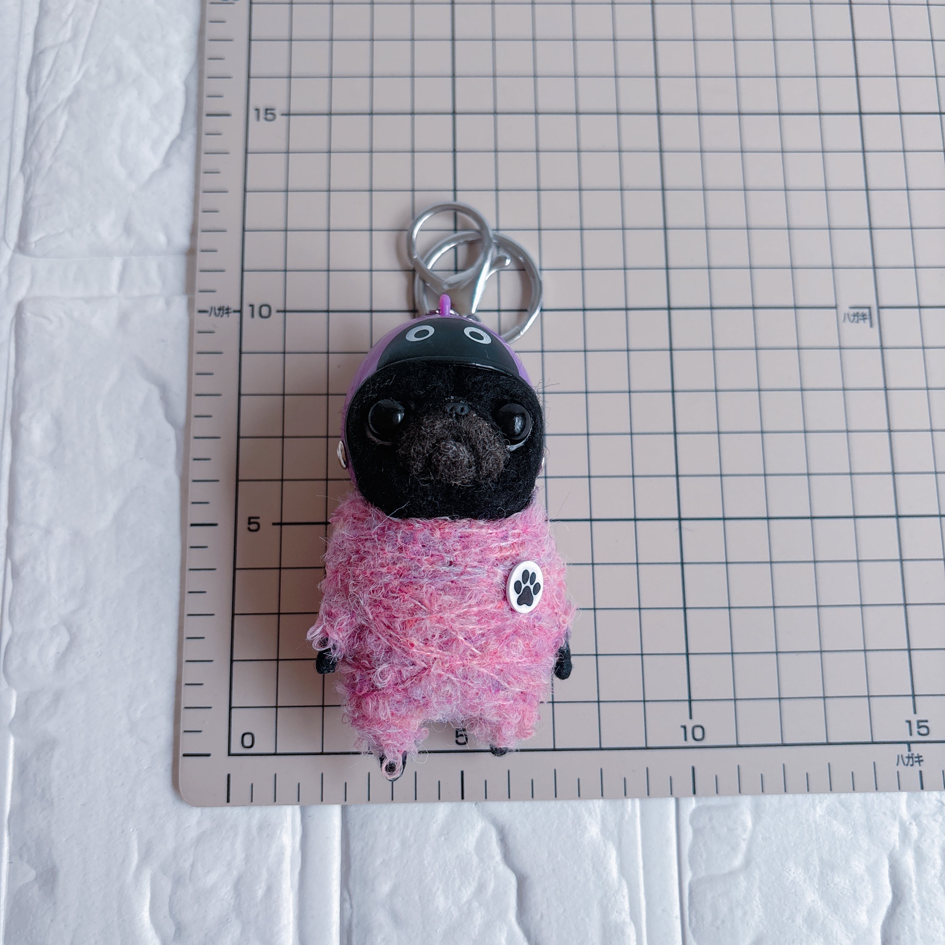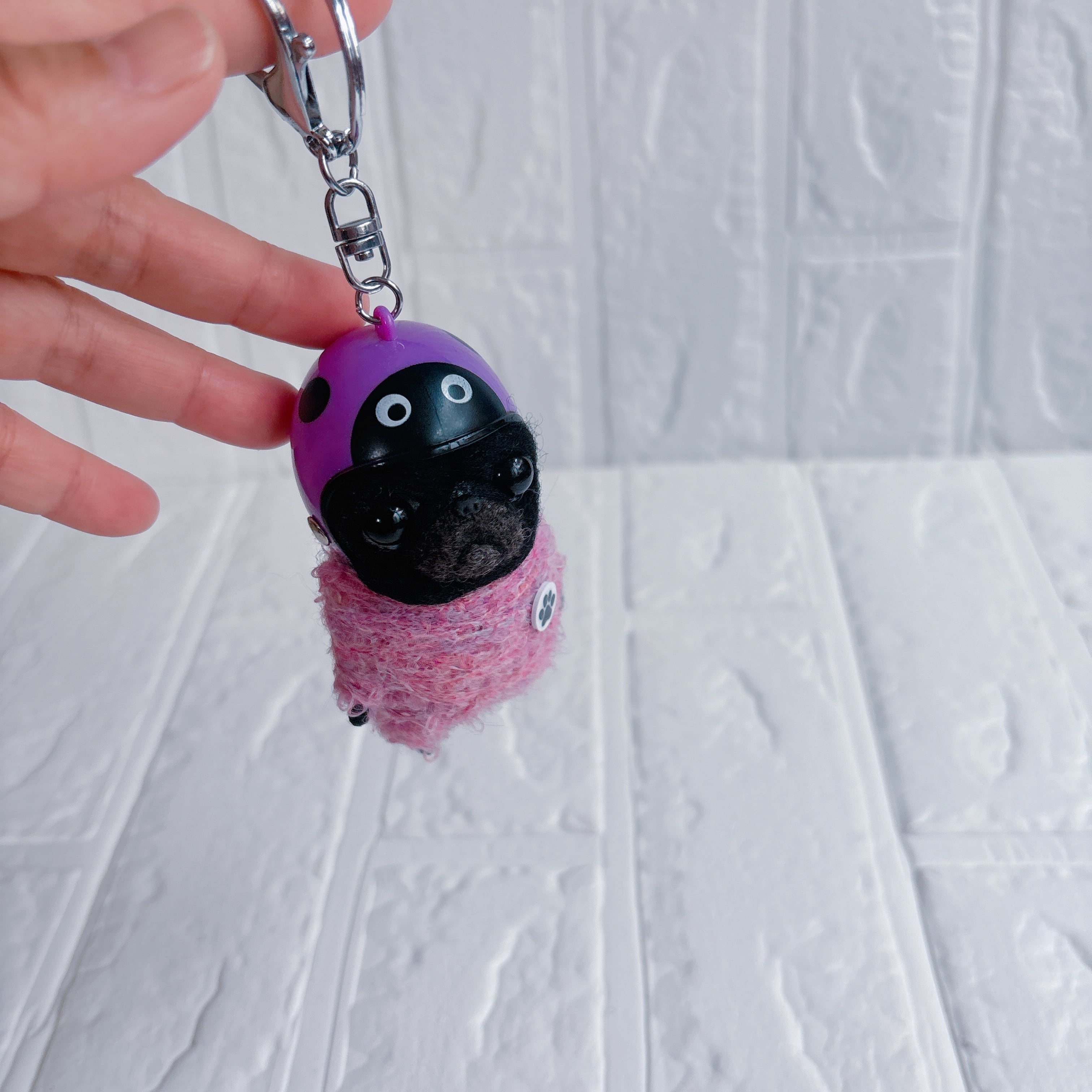 羊毛フェルト黒パグキーホルダーてんとう虫