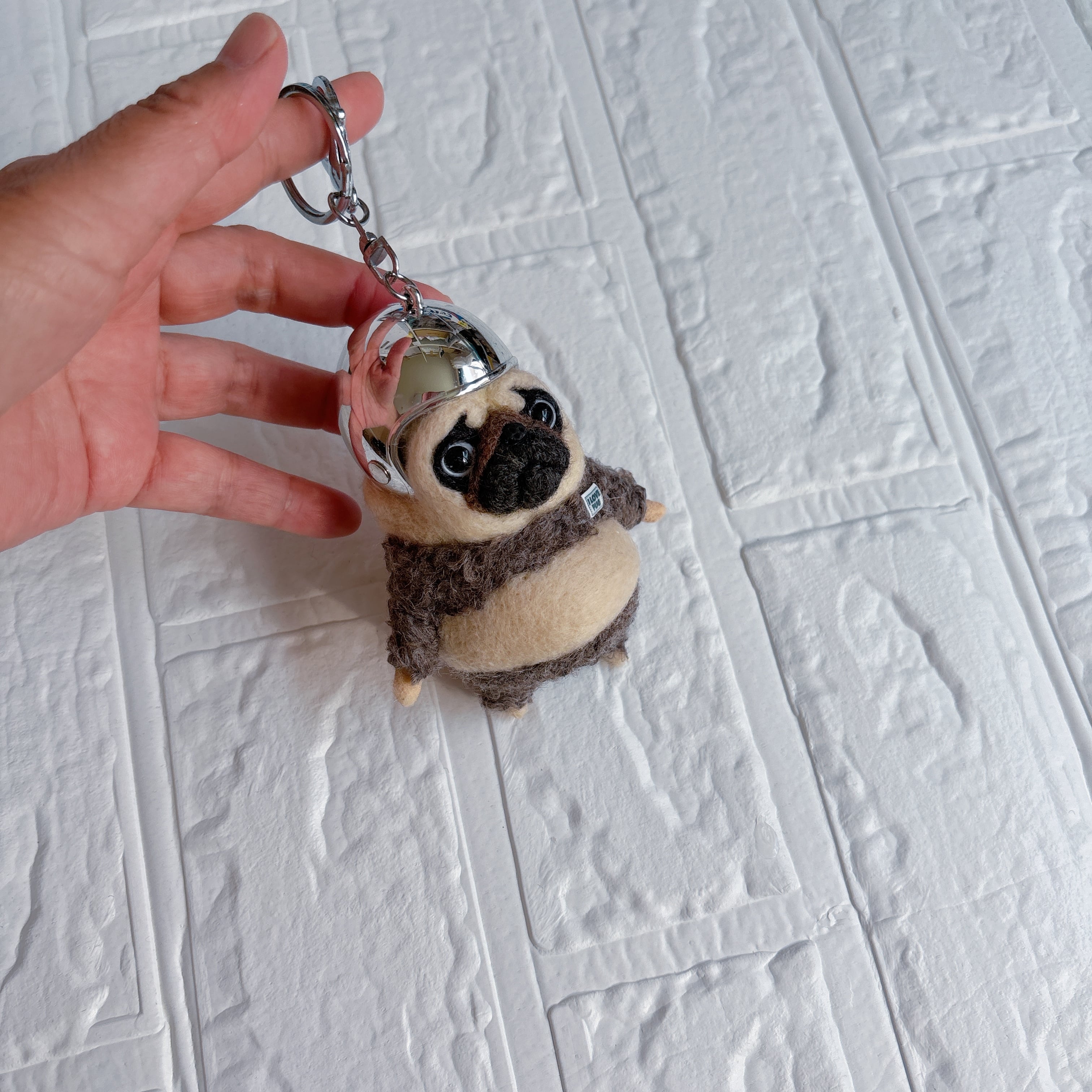 羊毛フェルトパグキーホルダーシルバー