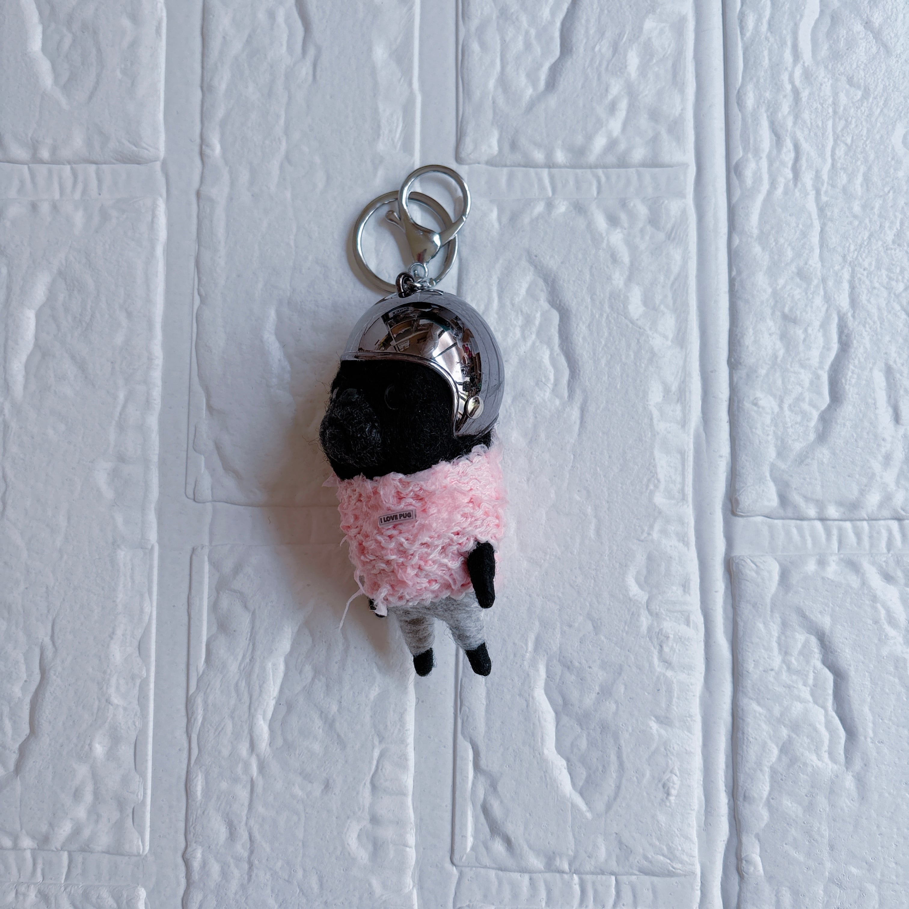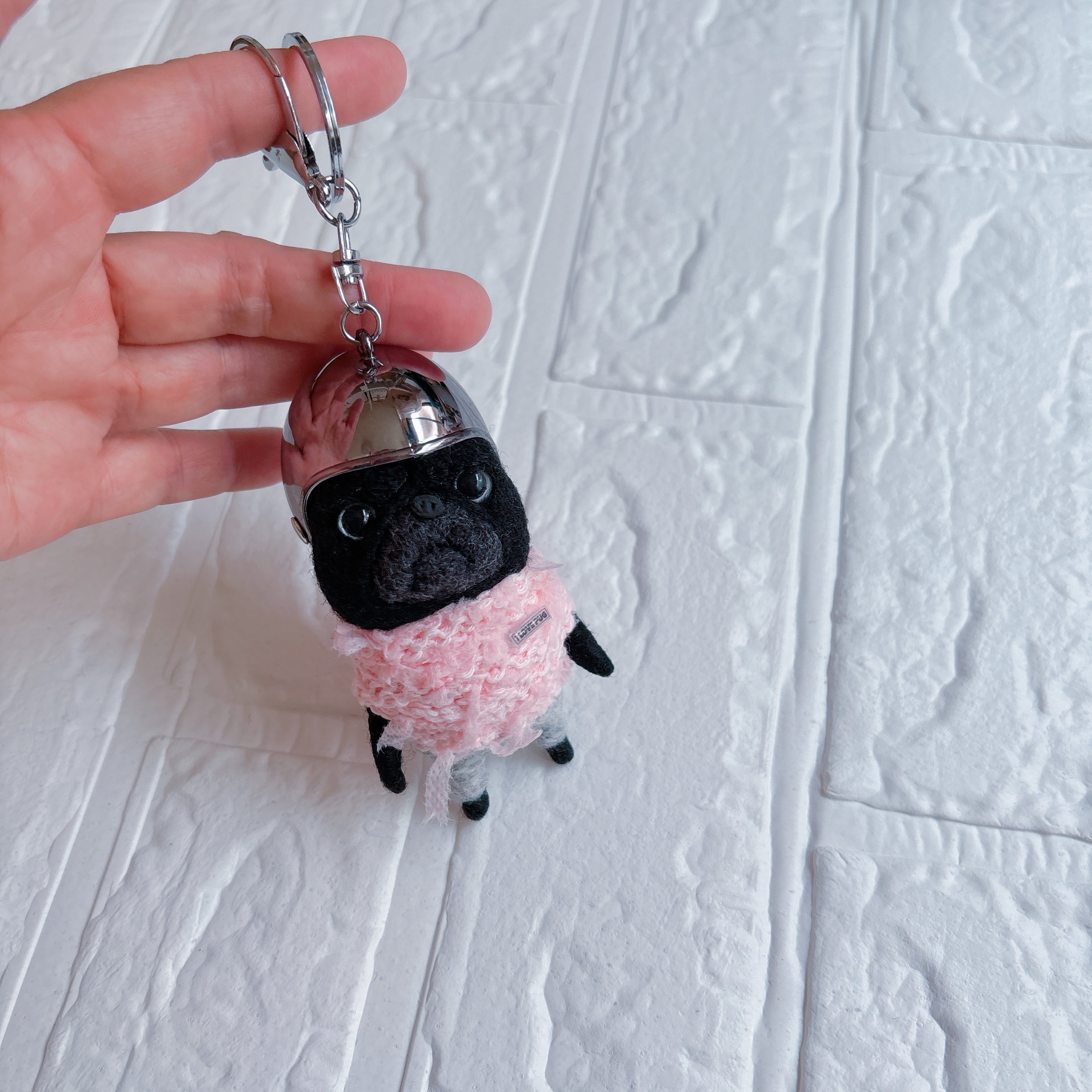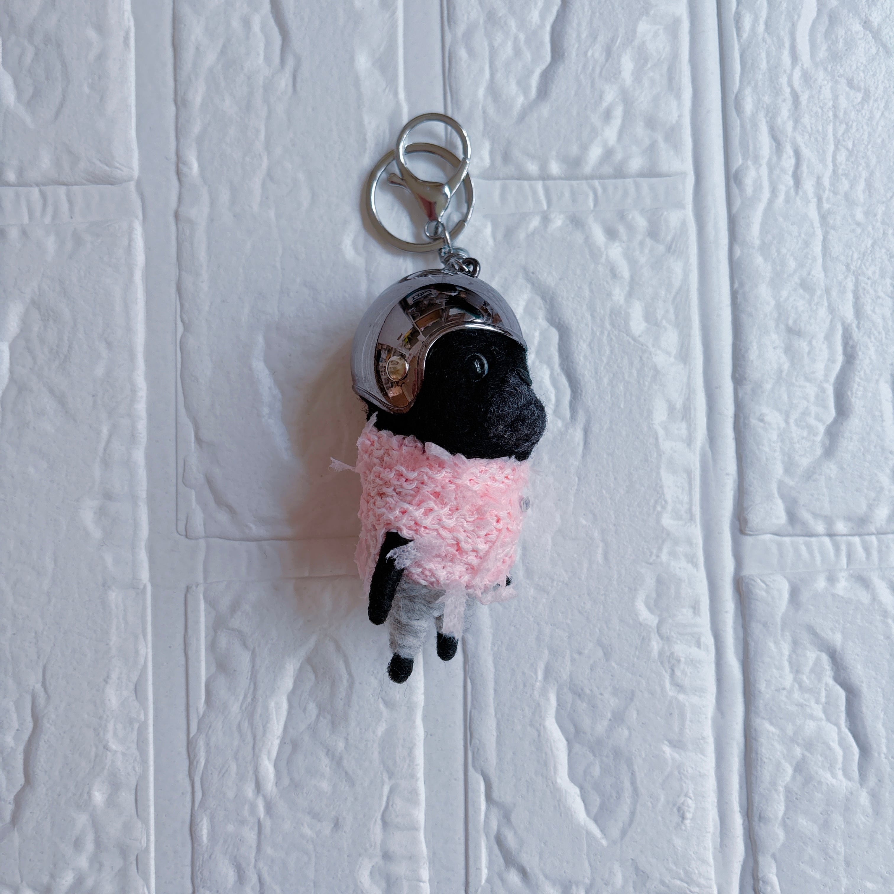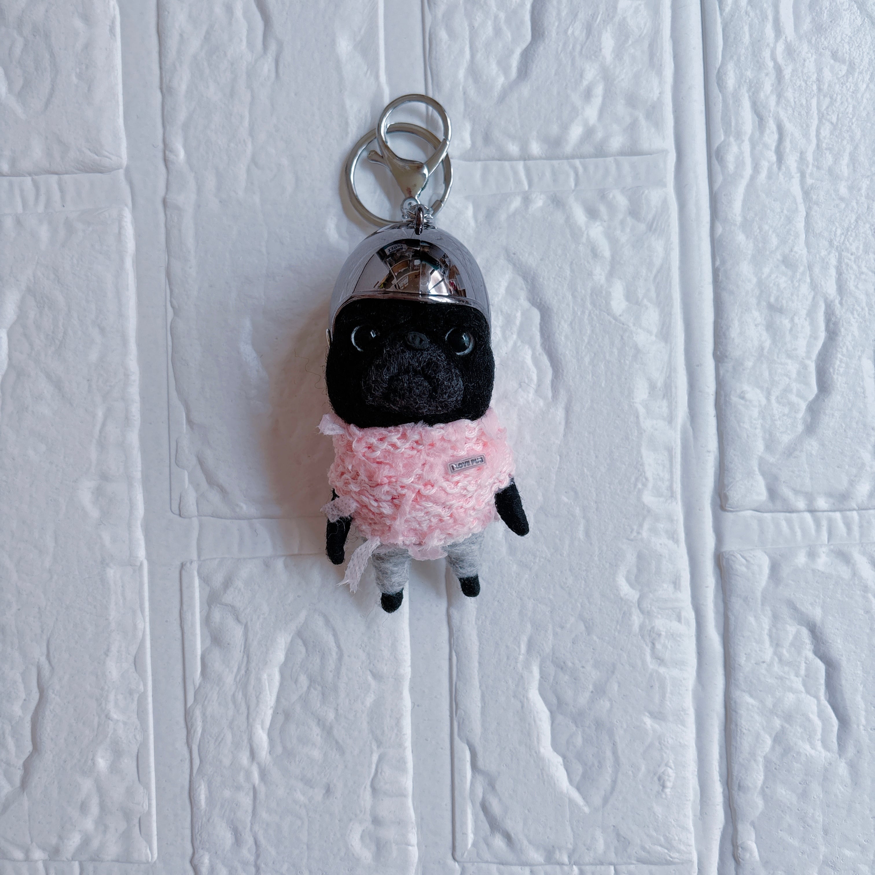 羊毛フェルト黒パグキーホルダーシルバー